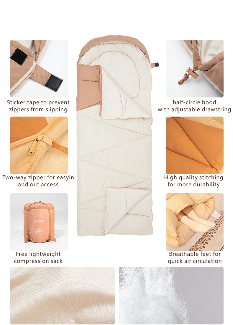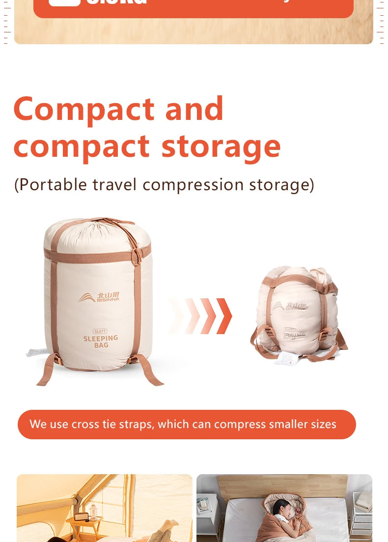 Compact and portable: This sleeping bag has its own compression bag, which has two tightable strips. Press bag and fixed by two strips, the volume will reduce 2 times than before. After compression, sleeping bag can put in backpack or hang on backpack suspension system.