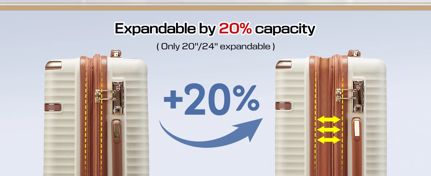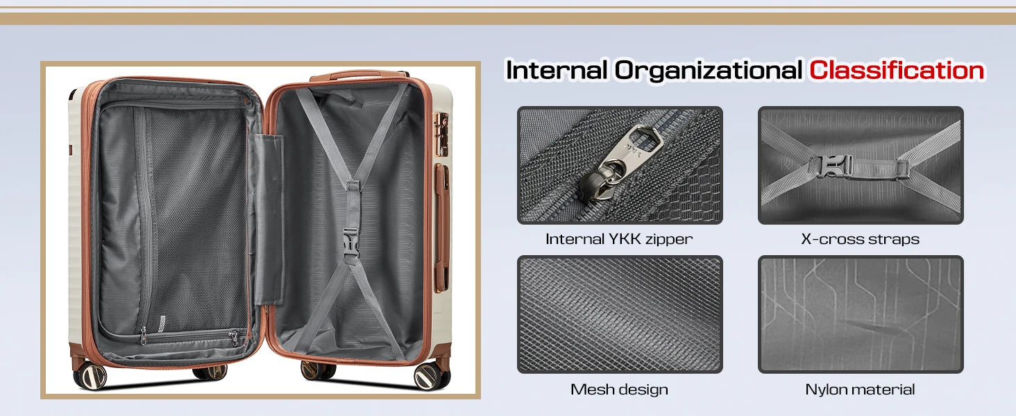 Expandable 20% Capacity:The hard shell luggage set is equipped with expansion zippers, which can increase the capacity by 20%. Meanwhile, the interior of the travel luggage sets is equipped with zippered compartments and X-shaped cross straps, making it easy to sort and organize your belongings.