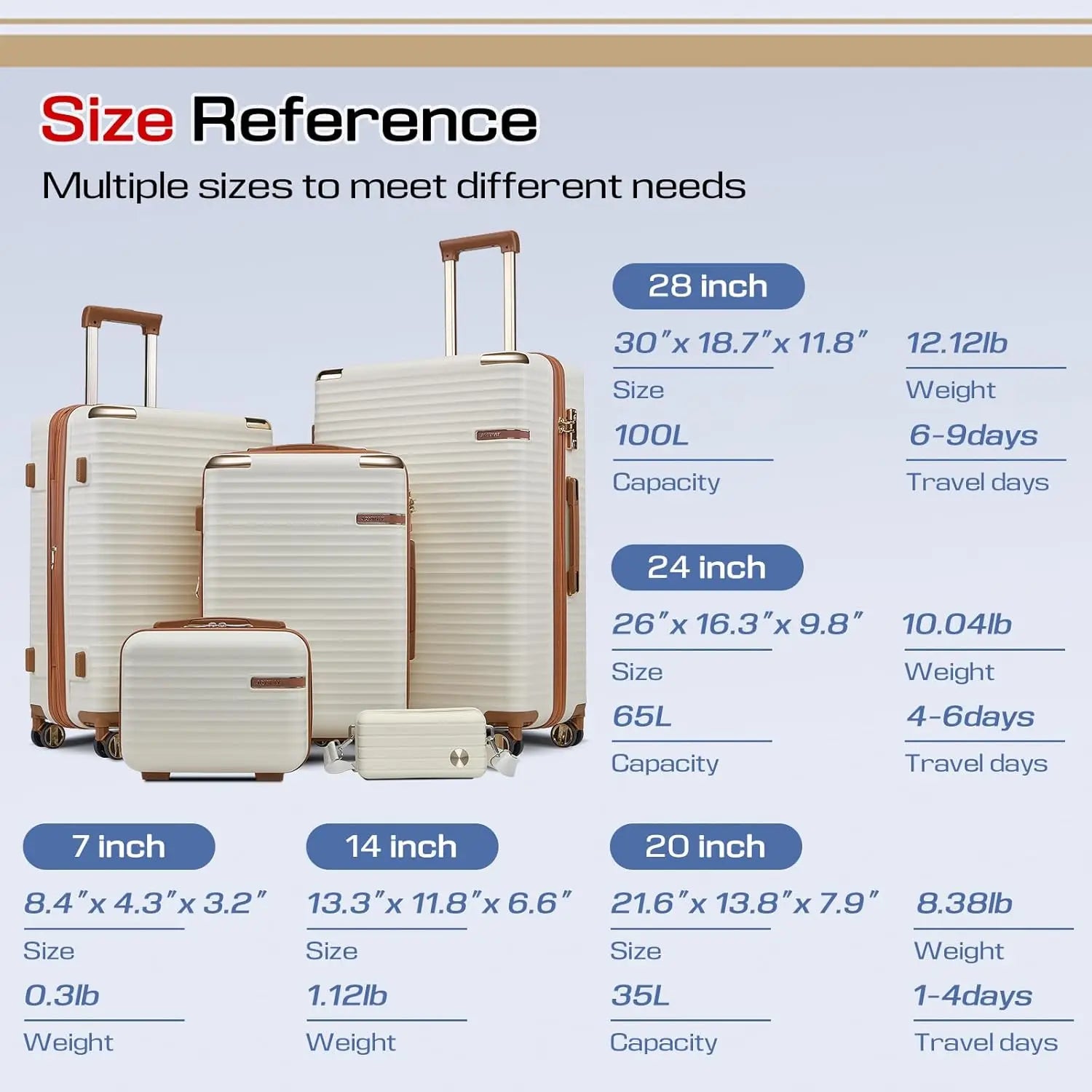 Luggage Set 5 Piece:This luggage set includes 7 inch diagonal shoulder bag, 14 inch cosmetic case, 20 inch carry on luggage, 24 inch checked luggage, and 28 inch large luggage. It is designed to meet your various travel needs.In addition, the suitcase set is made of ABS material with a sturdy shell to ensure durability and long-lasting use.
