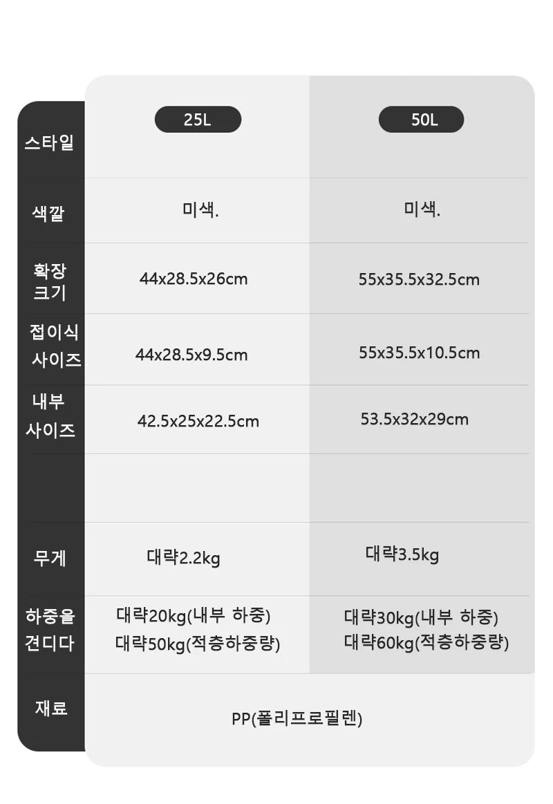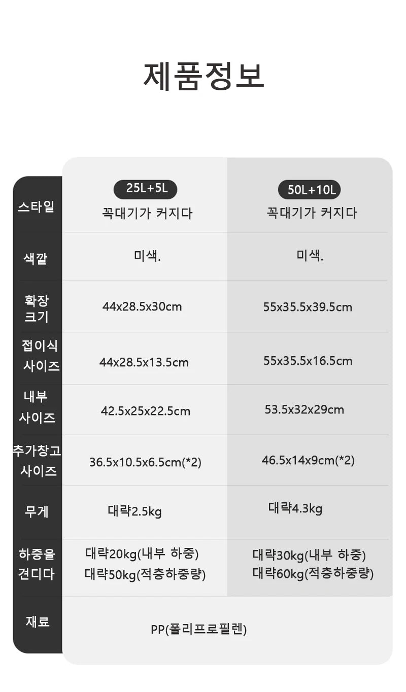 Size: 25L(44x28.5x26cm),25L + 5l (44x28.5x30cm), 50l (55x35.5x32.5cm),50L + 10L(4.3kg)