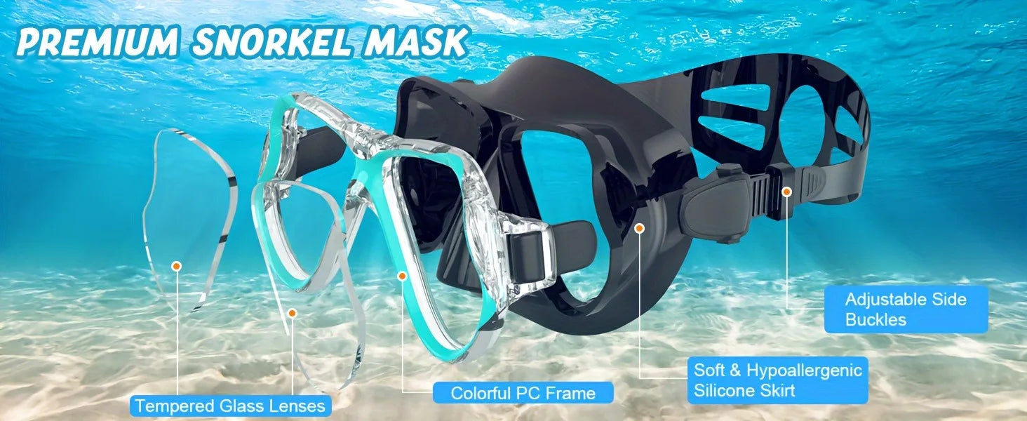- 180° Panoramic, Snorkeling Mask and Snorkel tube Set of 2 in 1 - HD durable impact-resistant anti-fog lenses, dry top silicone snorkel. Our snorkel set provides you a 180 degree field of vision, and offers superior views for beautiful underwater adventures. Our snorkeling set has the gear you need for snorkeling to help you explore the underwater world cheerfully.